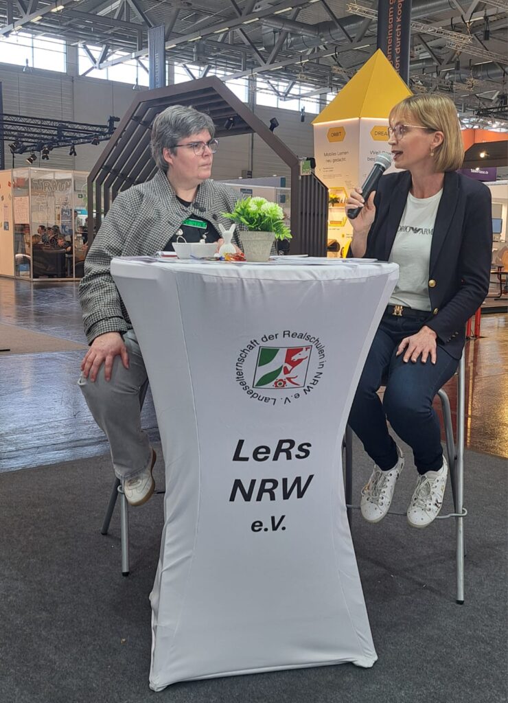 Den Abschluss unseres Programms am dritten Messetag bildete ein Stehtisch-Talk mit Frau Wanders von lehrer nrw. Gemeinsam sprachen wir über zwei Themen, die aktuell viele Schulen beschäftigen: Gewalt an Schulen und die Gesundheit von Lehrkräften sowie Schülerinnen und Schülern.
